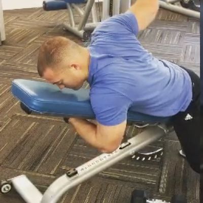 Day 4: Single Arm, Dumbbell, Forward Forearm Flip BacksSingle arm, dumbbell, forward forearm flip backs. Keep your elbow down on top pad of flat bench. Opposite hand on your hip for stable balance. Lower dumbbell 80% to touching the bench before retracting to original position. Adjust the incline of the bench based on your height. Begin with 10 lb dumbbell.