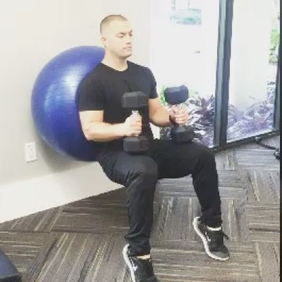 Day 2: Swiss Ball, DB Resistant Squat to Calf RaiseSwiss ball against wall, dumbbell resistant squat to calf raise. Start in squat position with dumbbells resting on thighs. Come up onto toes and rise up to full extension before returning to heels. Begin using 10 lb dumbbells.