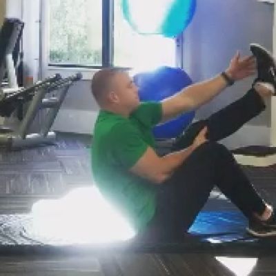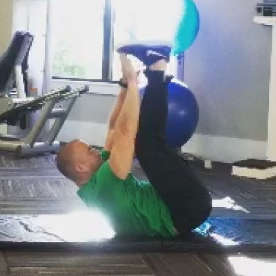 Day 2: Swiss Ball, Reverse Hamstring Extension, Knee RaiseSwiss ball against wall, single leg hamstring extension, floor touch, knee raise. Tuck your chin looking bottom of the wall when reaching for floor. Slight bend at your elbow balancing the ball, and in standing leg knee for total balance.