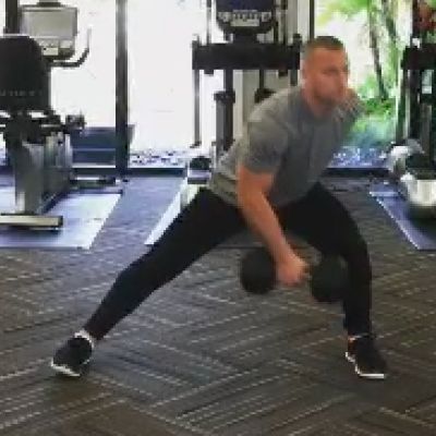 Day 3: Wide Stance, Cross Body Dumbbell DeadliftWide stance, cross body dumbbell deadlift. Set the dumbbell up over your foot. Kick your hamstring back 80% and reach to pick the dumbbell up with your opposite arm. Begin using 20 lb dumbbell.