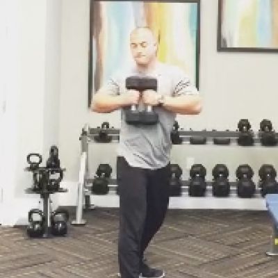 Day 1: Catchers CurlsCatchers position dumbbell bicep curls. Keep weights together throughout lift. Keep knees tracking over ankles and back upright to engage core. Keep hamstrings parallel to floor. Begin with 10 lb dumbbells.