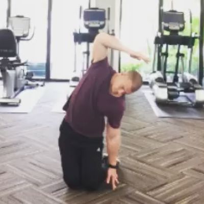 Day 3: Lawnmower Row to Top Shelf Torso TwistStaggered stance, lawnmower row to top shelf torso twist. Drop your back knee down keeping your spine upright and your front foot pointed forward aligned with your back foot. Be sure to keep your front knee tracking over your front ankle. Keep your elbow as close to your body as possible through row. Pivot only the back foot on torso twist, turning your head along with your torso. Begin setting cable to 15 lbs.