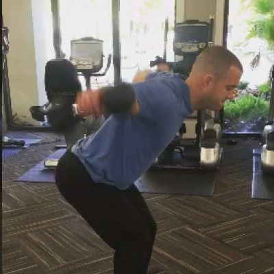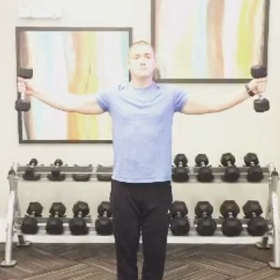 Day 1: Lateral Dumbbell FlyLateral dumbbell fly. Kick hips back. Bring feet together with a slightly forward lean for proper back alignment. Begin with 10 lb dumbbells.