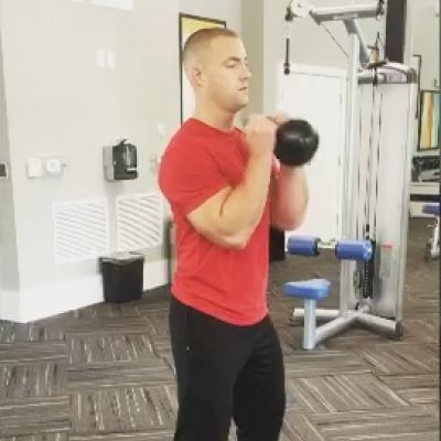 Day 1: Kettlebell Forearm CurlFeet shoulder width, kettlebell forearm curl. Keep elbows tight to body curling weight from your belt to your chin. Begin with 20 lb kettlebell.